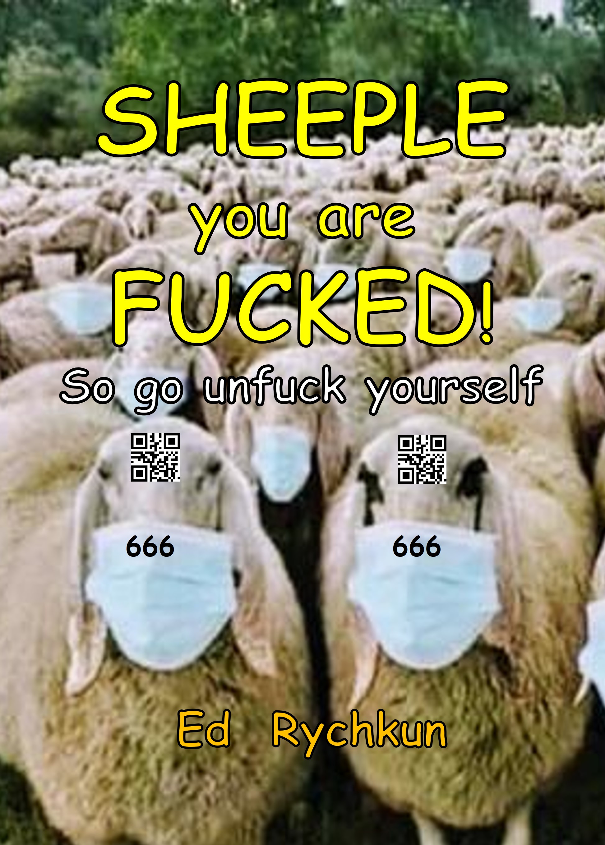 | SHEEPLE you are FUCKED! So go Unfuck Yourself   Several decades ago the Globalists took action deciding that they had enough people fucking up the planet. Being in control of money, they began to set up their required global infrastructures to conquer the greatest kingdom of all: PLANET EARTH INC. Their age old strategy of divide and conquer was different in that it needed a global strategy to divide all people, pit them against each other and puppeteer a silent world war using information and hypodermic needles as their weapons. So they launched a clever plan to dominate corporations, governments and money through takeovers and coups. Having achieved that they had to get the free-range sovereign Peoples into Sheeple pens so they could get control of them in preparation for creating a new obedient Artificial Intelligent (AI) synthetic humanoid slave. For their Endgame strategy, the best plan was to launch a hypnotic spell, a campaign of mass psychosis of using a great threat called Covid-19. This would work like hypnosis under Mass Psychosis to fragment, focus group consciousness on anxiety and lose their ability for rational thought. This strategy required total control of Mainstream Media and key corporations. At the dawn of 2022 we see how effectively the vast majority of humans on the planet have been conquered by finance and vaxx potions. To put it mildly: Humans are currently fucked. In this book, the details of how this has happened, why it has happened, who are the perpetrators, what are the real threats, and how to remedy the threats are revealed in detailed references and protocols. Most important is what you can do about it and to go unfuck yourself if you have become a bioweapon victim of this War against humanity. More important is the war has not been lost by the Good Guys who also have a plan.   SHEEPLE you are FUCKED! (lulu.com) SHEEPLE you are FUCKED!: So Go Unfuck Yourself - Kindle edition by Rychkun, Ed. Religion & Spirituality Kindle eBooks @ Amazon.com.